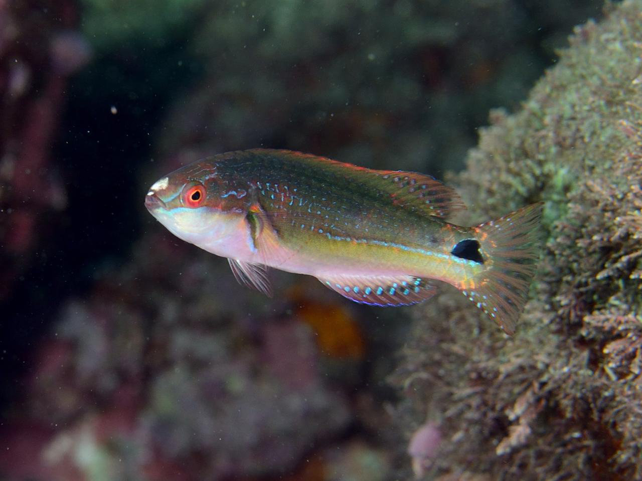 夏のIOPではわりと成長したニシキイトヒキベラの子供が結構いたんですが、1回海が荒れた後にほとんど姿を消してしまいました。きっとどこかに集結してるに違いないとは思ってたんですが、本当に集結してました。しかもこんな緑色になっちゃって。(^^)