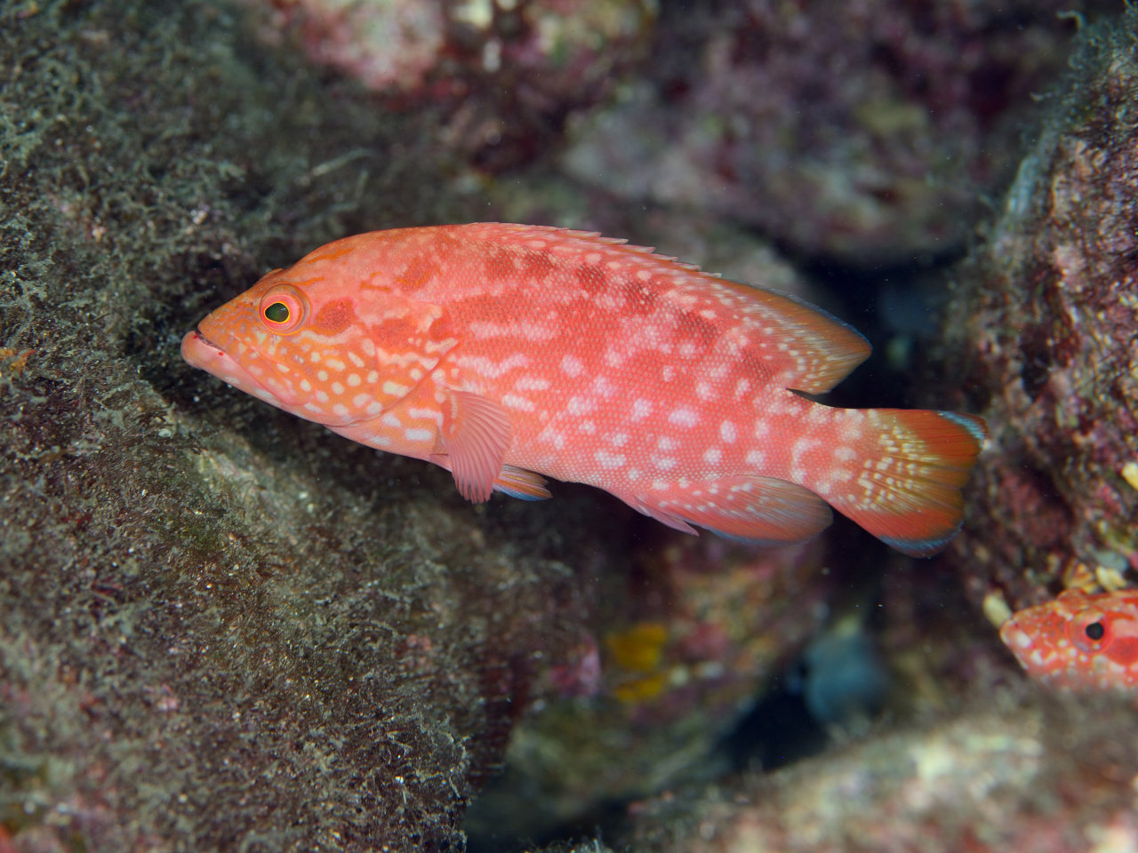 尾ビレの後端近くに斜めに明色の線が入るのが特徴です。同じように尾ビレに斜め線が入るニジハタと比べると、線の位置が後端寄りです。