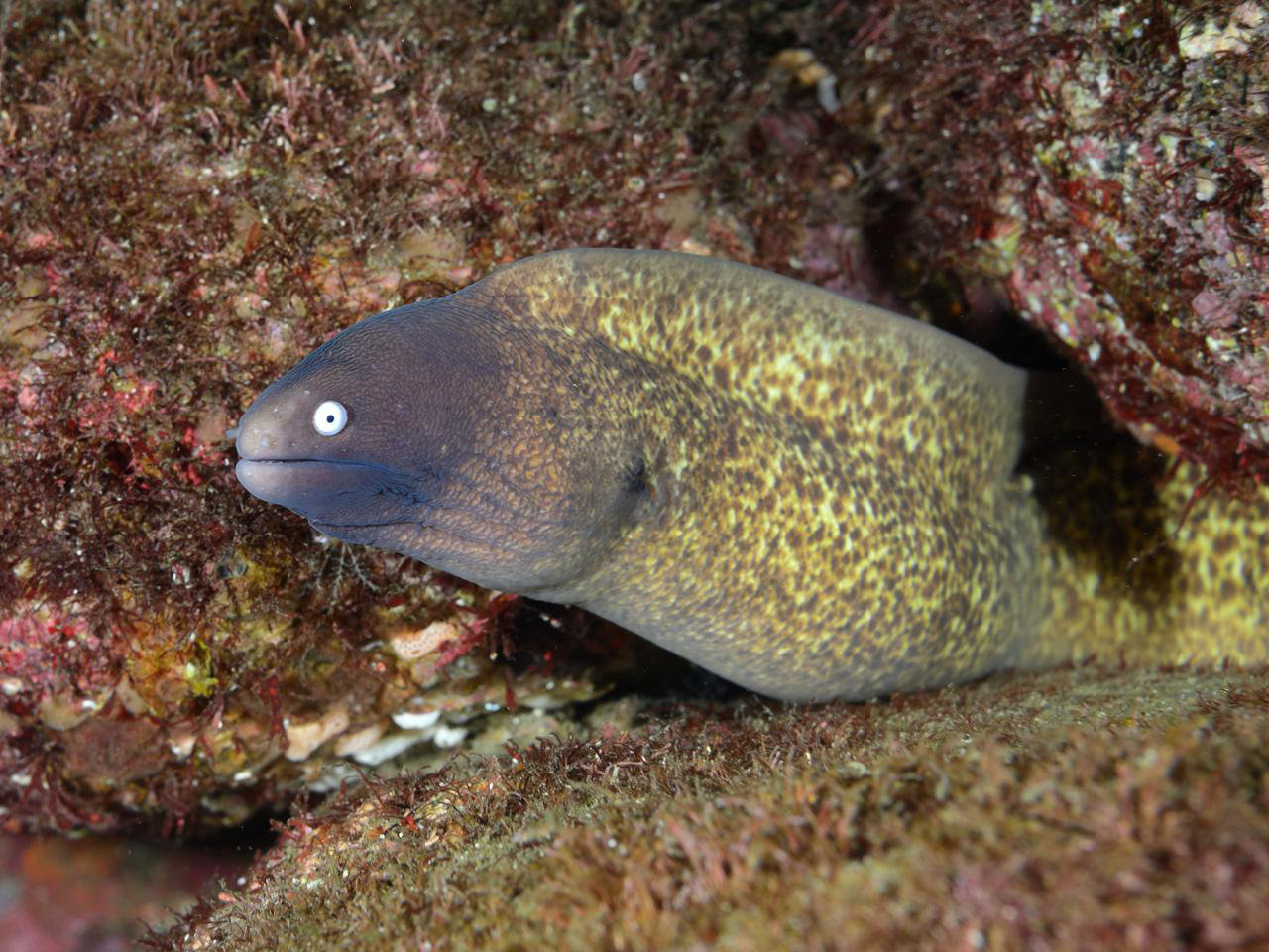 ウツボ界きっての可愛らしさ。。。のはずが、顎のあたりがシワシワで、歯も無いように見えるので、なんだか入れ歯を失くしたおばあちゃんみたいな印象の写真になってしまいました。(汗)