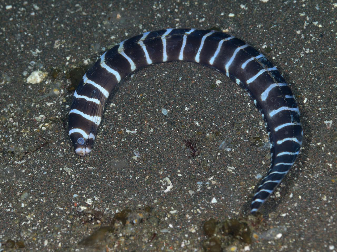砂地に住むウツボではないと思いますが、情報をもらった時に見せていただいた写真が、砂地にいる姿だったので、低水温に耐えられなくて弱って砂地に出てきちゃったのかもしれません。