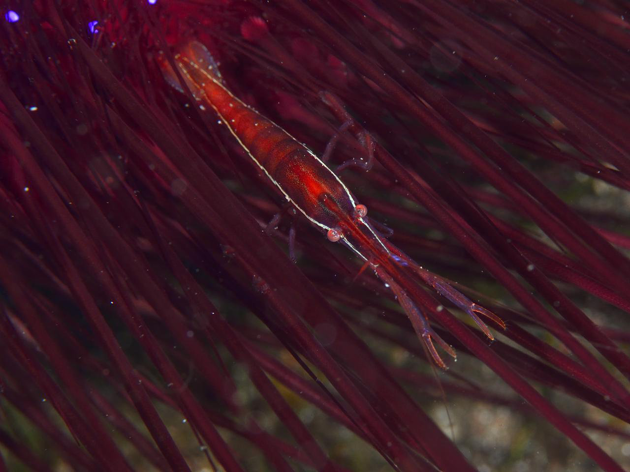 以前出会ったヤツと比べると白い線が細いし、ホストのウニもヒラタガゼじゃなくてヒラタガゼ属の一種1だったし、別の種類かとも思ったのですが、白い線の太さ以外はタンザクカクレエビと違いがないようです。