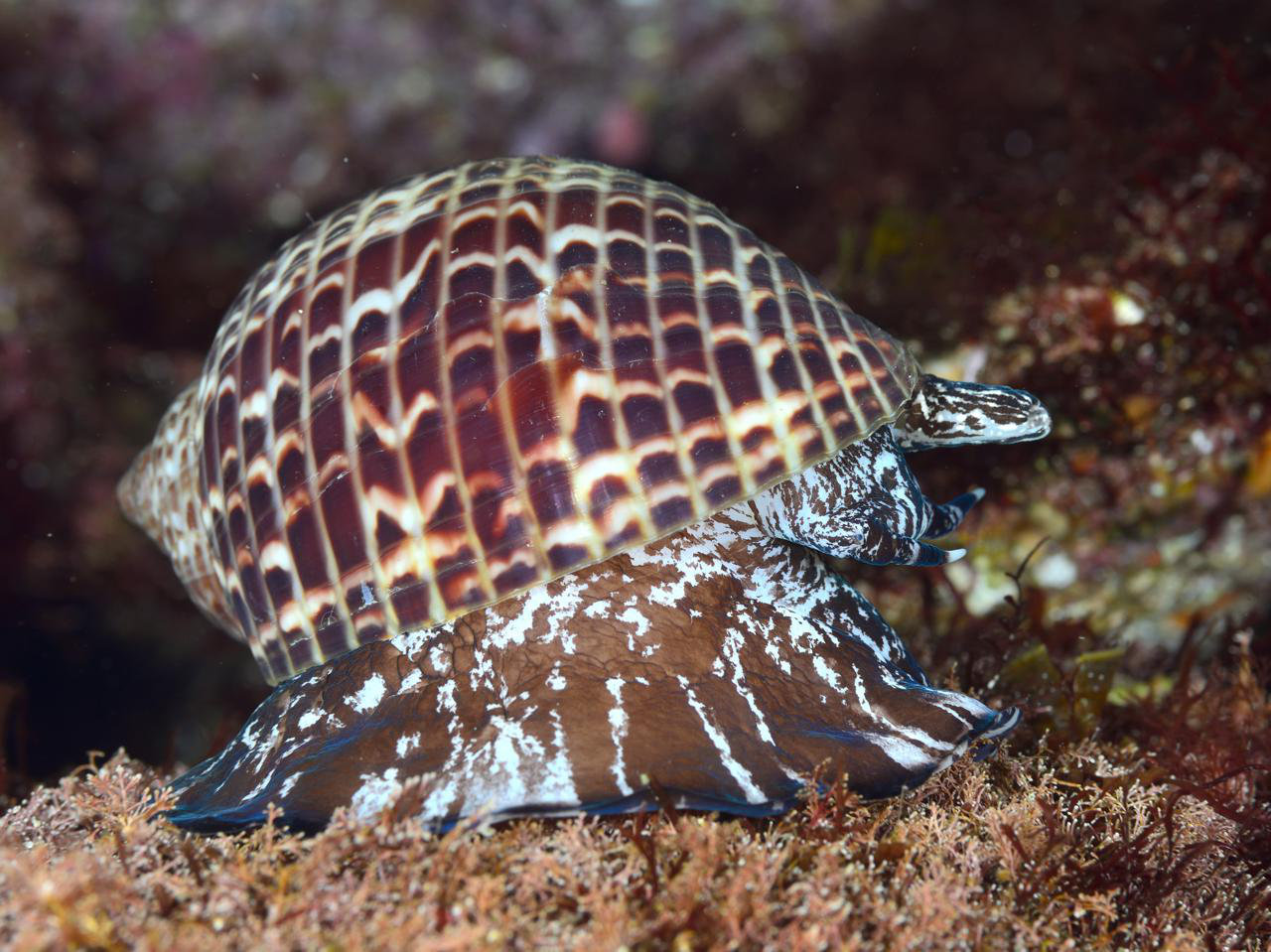 色の濃いヤツシロガイがいるなと思ったら、ウズラガイという種だったようです。 この貝殻の模様は、確かにウズラっぽい。(^^) (2026-02 大瀬崎 -6m)