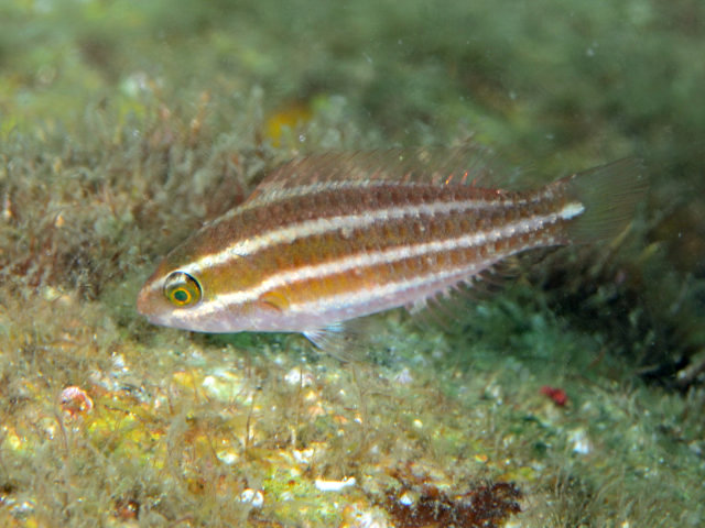 赤っぽいヒレに白い歯、ナガブダイのメスの特徴がかなり出始めている個体です。ボディはまだ赤って感じじゃなくて水中では目立たないけど、白い歯は結構目立ちます。