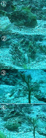(1)2匹のカワハギが寄り添って小さな砂地の上をぐるぐる泳ぎまわってます。