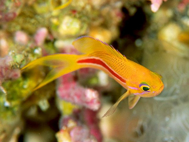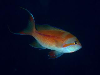 大人のスジハナダイは、IOPの2の根や大瀬崎の柵下で、何気に中層を泳いでるのを見かけたりしてたのですが、子供のスジハナダイはずっと見たことがなかったのです。どこにいるんだろうと疑問だったんですが、こないだキシマハナダイの幼魚を見に行くために、4の根の方に降りていったら、-40mぐらいの岩陰に数匹が群れてました。ハナダイの子供って岩陰にいるんだ!