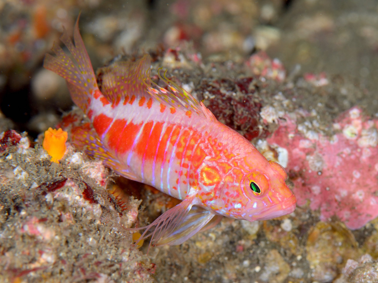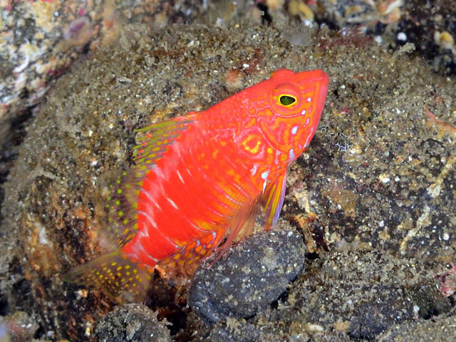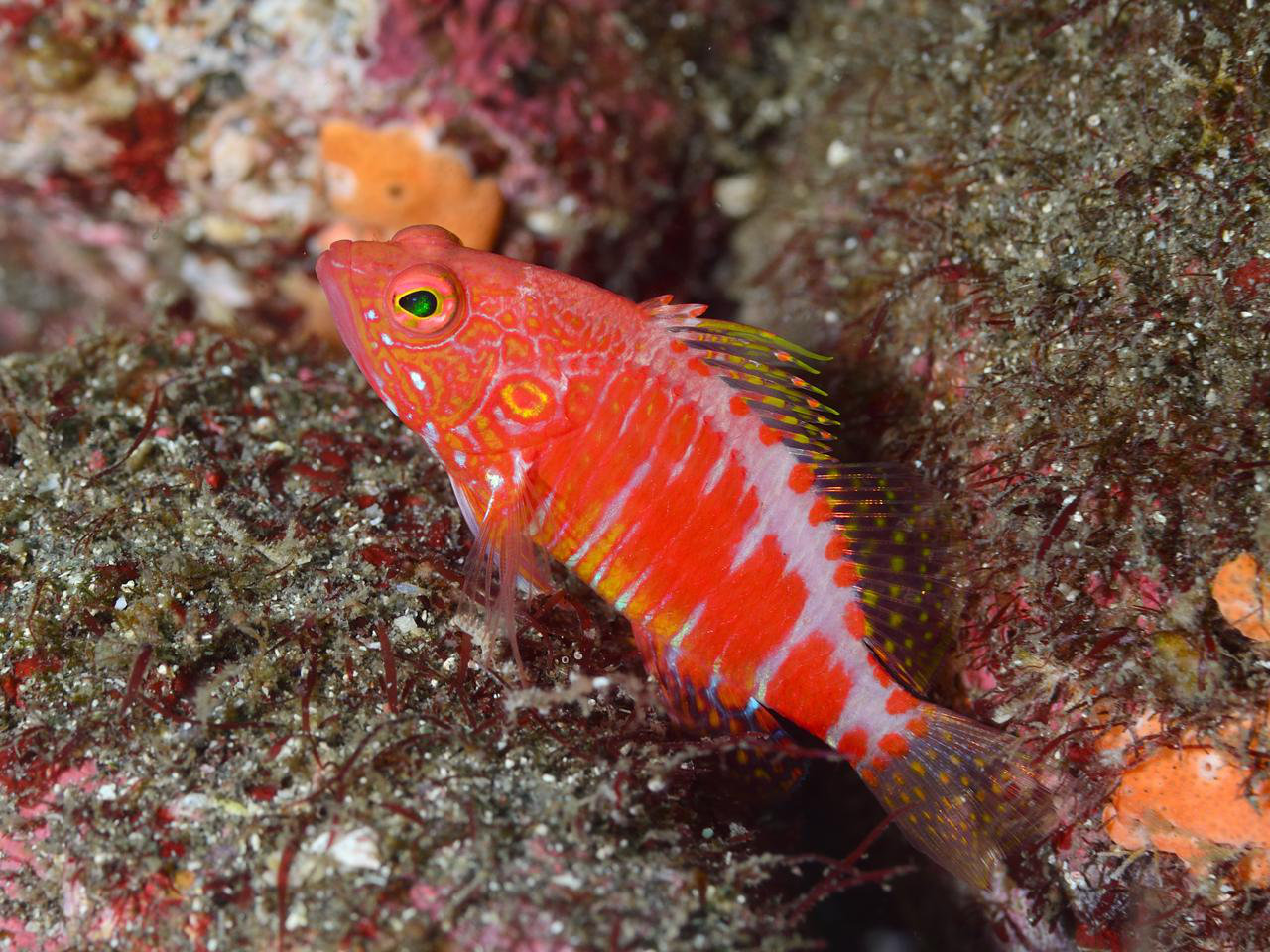 オシャレハナダイってサカナは若干南方種のようで、大瀬崎では滅多にお目にかかれないサカナですが、このときは滅多にお目にかかれないオビトウカイスズメダイと一緒にいたという、鼻血ブーなシチュエーションでした。