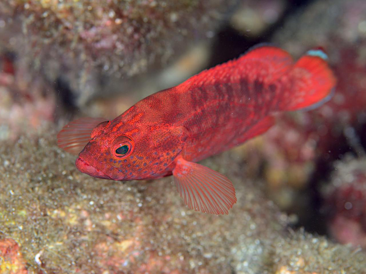 尾ビレの後端近くに斜めに明色の線が入るのが特徴です。同じように尾ビレに斜め線が入るニジハタと比べると、線の位置が後端寄りです。