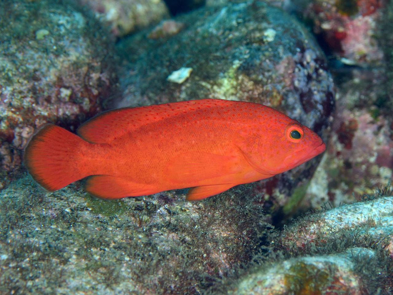青い点のない真っ赤な身体と、尾ビレを斜めに切り込むラインがないことが特徴です。