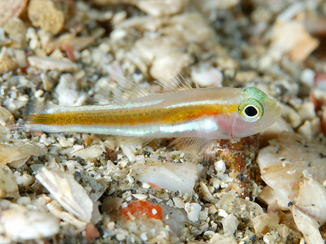 最近伊豆の海は青く暖かい潮に当たっていて、少々深く行ってもライト無しで小物が探せるのが、楽ちんです。そんな明るい海底で見かけたこのハゼ、最初は砂利溜まりに空いた穴の端に引っかかっていたんで、巣穴を持ってるのかと思いきや、撮影してると突然何かが巣穴に飛び込み、その反動で砂溜まりの真ん中に追い出されてしまいました。巣穴はコイツの物ではなかったみたい。見た目はベニハゼの仲間っぽいのですが、こんな表立った所にベニハゼの仲間がいたら、あっという間にオキトラギスかホタテエソの餌食になりそう。。。