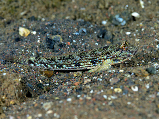 ハゼって一口に言っても、日本に棲んでるヤツラを集めただけでも分厚い図鑑ができるほど種類が豊富なんで、ダイバーは生態でカテゴリ分けすることが多いです。そんなカテゴリ分けの中でも、人気のヤシャハゼとかネジリンボウがいる共生ハゼグループと、クツワハゼとかヒメハゼのような彩度0のジミハゼグループは相容れないものがあります。と思っていたら、両者の深い溝を埋める彩度0共生ハゼがいたんですね~。それがコイツです。勝手なイメージを膨らませてきた自分としては、クツワハゼがエビと一緒に暮らしてる見たいで、とっても違和感があります。