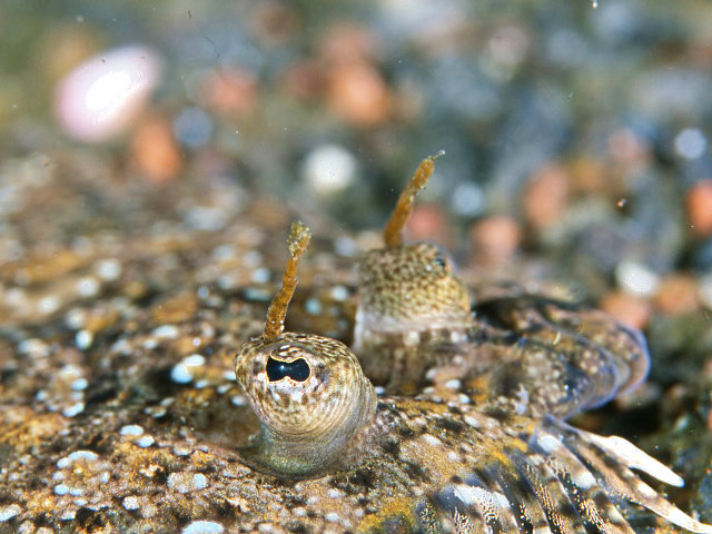 ダルマガレイの仲間のまっ平らな体は砂地にとけ込むためなのでしょう。突出した目は周りを見渡すためなのでしょう。じゃあ、目の上におっ立つアンテナみたいな皮弁は何かの役に立ってるの?実はこの皮弁で数十m先の獲物を検知できるとかだったら凄いけど。。。