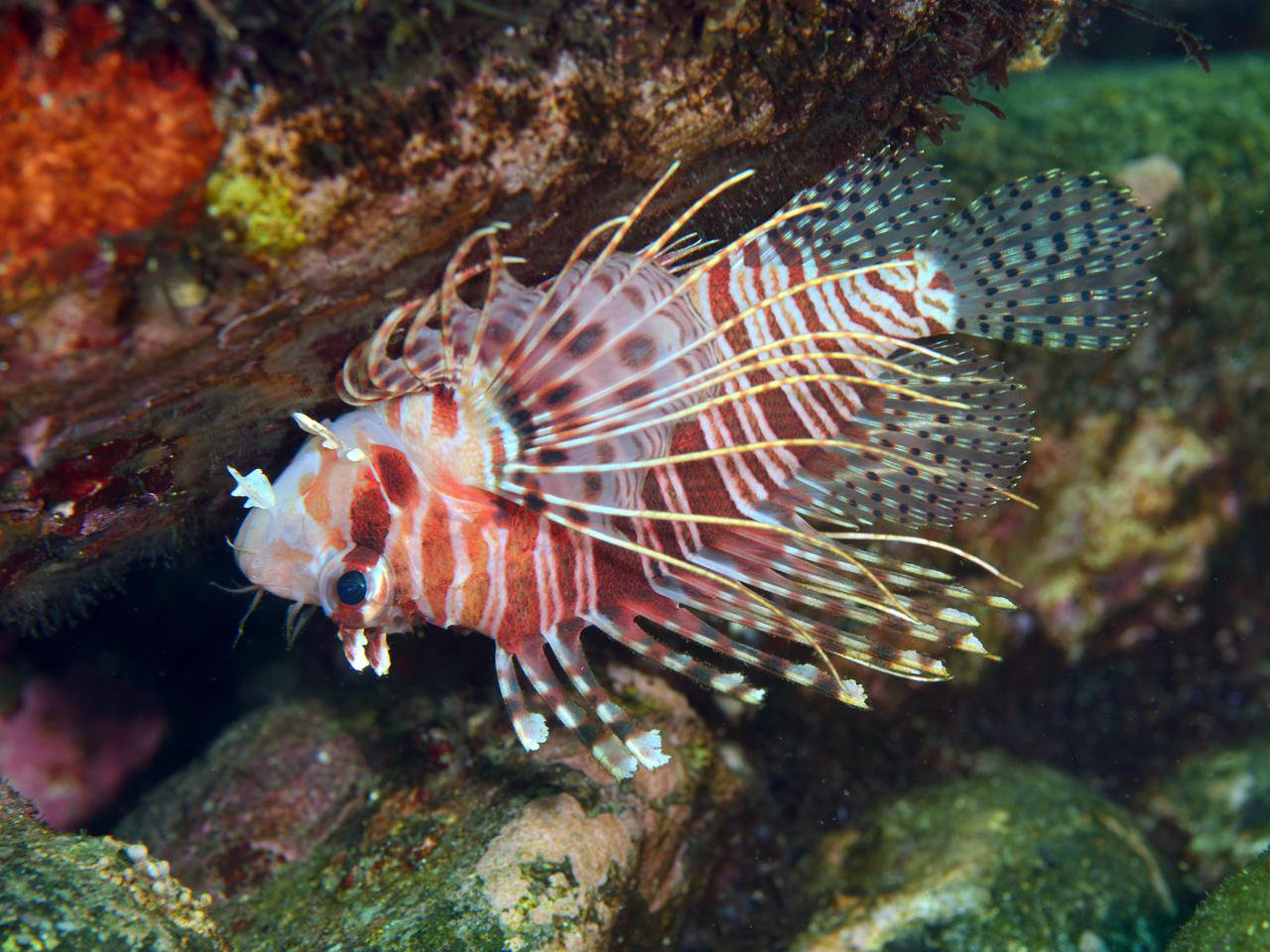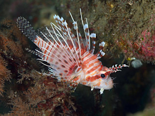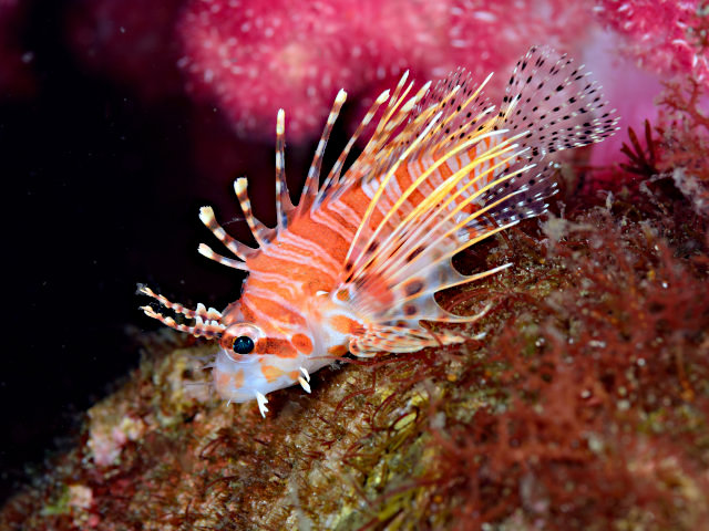 ミノカサゴの仲間はヒレが大きいから、波の強いところは水の抵抗が大きくて苦手なのかもしれません。そのせいか、比較的穏やかな大瀬崎に比べて、波洗うIOPにはミノカサゴの仲間が少ないように感じます。コイツもそんなサカナですね。