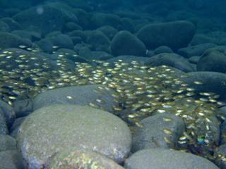 2010年の秋、大瀬崎ではそこかしこでアイゴのチビッコが群れてる姿を見かけます。こりゃ伊豆でも沖縄名物スクガラスが作れそうだなぁなんて思いながら見てると、結構タカベのチビッコ等が混じっています。実はスクガラスにも「シラスのタコ」みたいな楽しい発見ってあるのかも。 (写真は2020年に撮ったものと入れ替えました) (2020-09 大瀬崎 -1m)