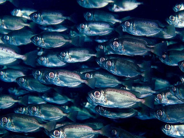 赤沢ビーチの堤防の先っちょで群れていました。この場所は意外な群れポイントで、季節によってはいろいろなサカナが集ってるのですが、どーしてココなのかはよくわかりません。釣り人のコマセ狙いにも思えないし。。。 (2002-10 赤沢 -5m)
