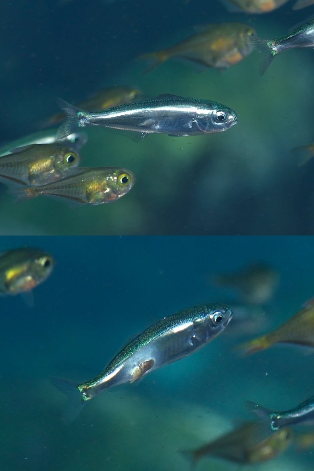 冬のブリマチ@IOPの入り口にあるミドリイシ付近に、あまり見かけないサカナが群れてた。魚屋に並びそうな色形してるけど、イワシにしては短いし、アジにしては肉厚すぎる。ボラかな?いや、質感が違うような。。。やっぱりサバか??ただでさえこの手の幼魚はわかりにくいのに、ちっとも近づかせてくれないから写真も撮れない。。。もーいーやと諦めてエギジット口に向かって泳いでたら、同じサカナが1匹だけキンメモドキの群に混じってた。どうやら傷ついて仲間とは一緒に泳げなくなり、しかたなく泳ぎが緩やかなキンメモドキの群に居候してる様子。とにかく撮影のチャンスだ!!ってことで、写真を撮ることができたわけだけど、やっぱり種類はよくわかんないや。