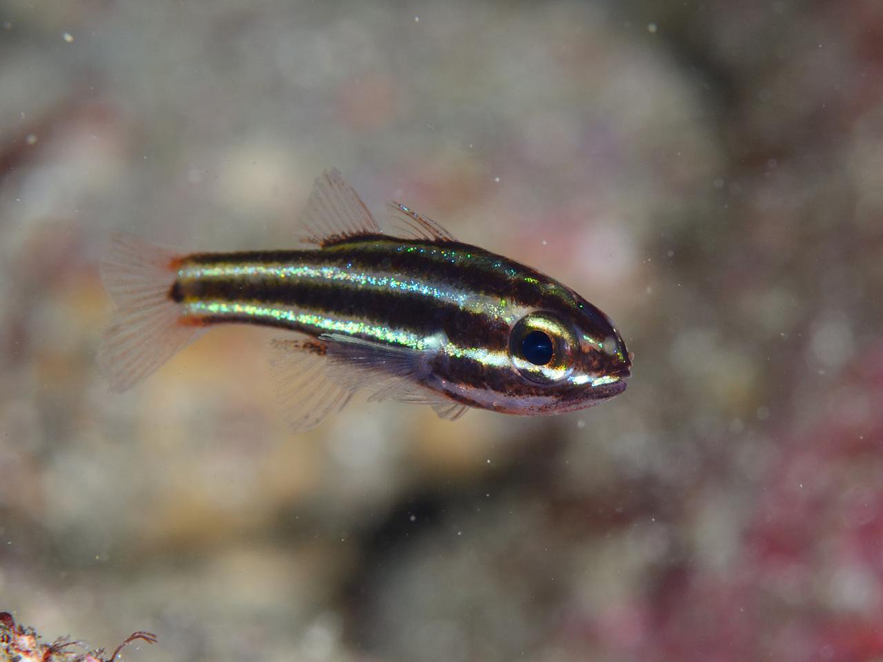 最初に出会った時は、ミナミフトスジイシモチだと思っていたし、最終エギジット時間も迫っていたので、とりあえず2〜3枚シャッターを切っただけでしたが、家で写真を拡大してみたらヒレのフチが青く輝いているので、こんなミナミフトスジイシモチもいるのかな?と思ってネットで調べたら、ウスジマイシモチといサカナだったみたいです。。。