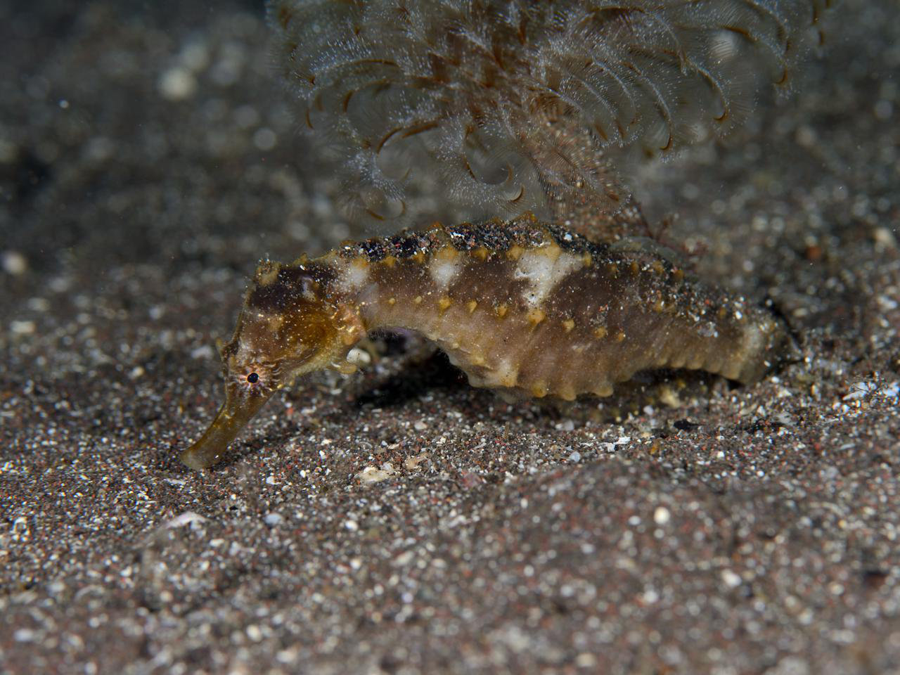 背中の白斑がハッキリした個体です。 先日、海でタカクラタツとオオウミウマの違いを聞かれて、「タカクラタツはぽっちゃり型で、オオウミウマはスマート」と答えたものの、この背中の白斑もポイントになるのかもしれません。 まぁ、頭のとんがり具合とか、吻の長さを見れば良いのかな? (2025-11 大瀬崎 -15m)