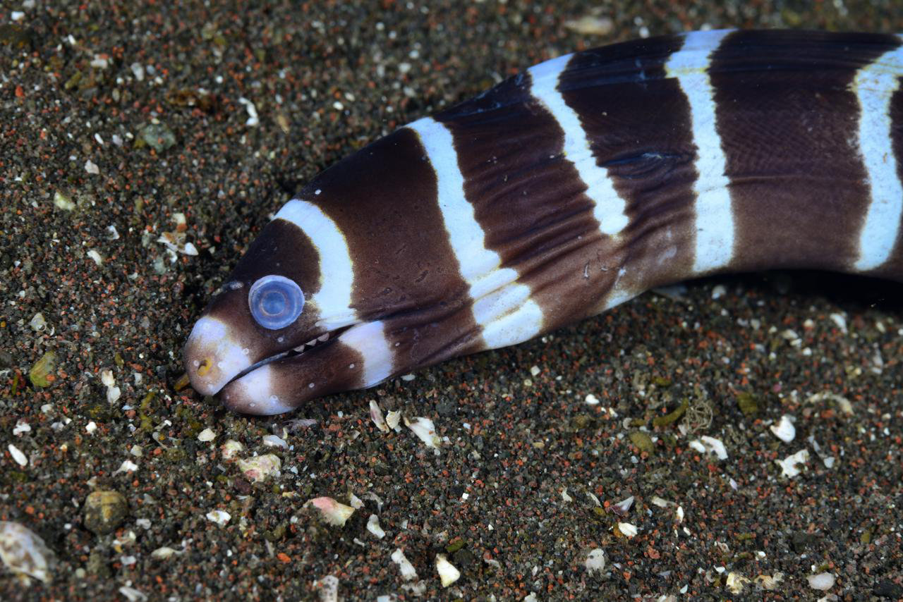 砂地に住むウツボではないと思いますが、情報をもらった時に見せていただいた写真が、砂地にいる姿だったので、低水温に耐えられなくて弱って砂地に出てきちゃったのかもしれません。