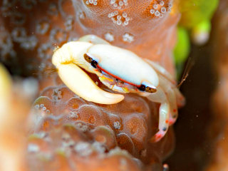 コイツラは、日中はサンゴの枝の隙間にに入り込んでいてあまり出てきませんが、夜になると気持ち大胆になって、撮りやすいと感じます。 でも、夜の体色はやっぱり昼間とは少し違っていて、目の間の黒い帯が薄くなってるようにも思えます。 ところで、写真を見ると脚の関節から毛が生えてるのですね!初めて知りました。・・・いや、これは藻かな? (2024-11 大瀬崎 -2m)