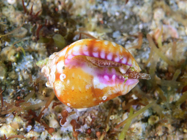 丸くて鮮やかで可愛いからでしょう、ビーチコーマにはメジャーなカイのようで、ネットで検索すると貝殻の写真はたくさん出てきます。こんなに貝殻が目立つのに、軟体部はなんとなく周りの風景に溶け込むような色彩ってところがさらに可愛い。(^^ (2020-08 大瀬崎 -5m)