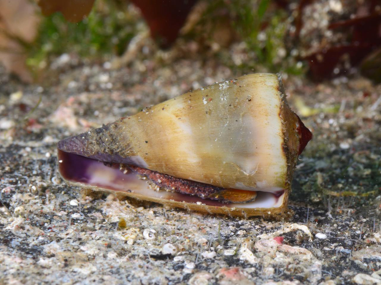 B面です。 ナガシマイモは、粒々の模様が入ったり入らなかったり、バリエーションがあるようですが、殻の内側の紫のパターンは同じようですね。 (2026-02 黄金崎 -7m)