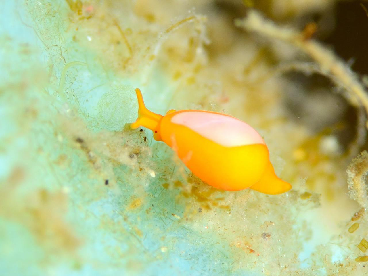 春、岩にくっ付く黄色の"・"をよく見るとこんなヤツだったりします。 普段の姿はまっ黄っ黄なんだけど、写真を撮ろうと思って不用意に石を動かしたりすると、ちょっとの水流に敏感に反応して、黄色い外套膜を引っ込めて、白いカイにになってしまいます。これはこれでツルツル感がスキ。 (2018-03 大瀬崎 -5m)