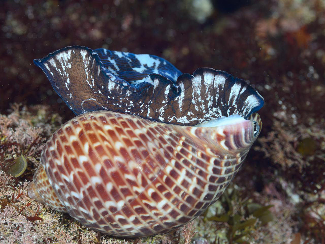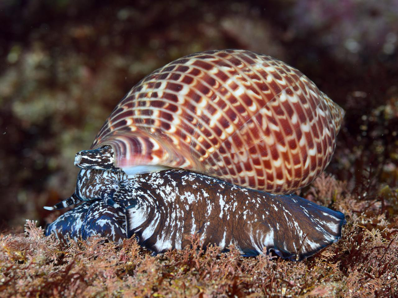色の濃いヤツシロガイがいるなと思ったら、ウズラガイという種だったようです。 この貝殻の模様は、確かにウズラっぽい。(^^) (2026-02 大瀬崎 -6m)