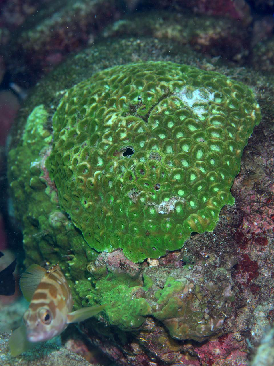 ふと、海底温泉が湧き出す岩の亀裂の横を見ると、キクメイシの仲間が張り付いてました。ヤツラも暖をとりながら伊豆の冬を乗り越えようとしているのでしょうか?
