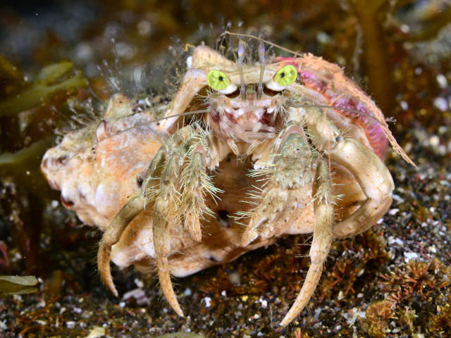 黄色い目がステキなヤドカリです。目以外はとってもジミですが、これでも南方種のようで、2月の伊豆で出会えるのは高水温の恩恵ですかね〜?